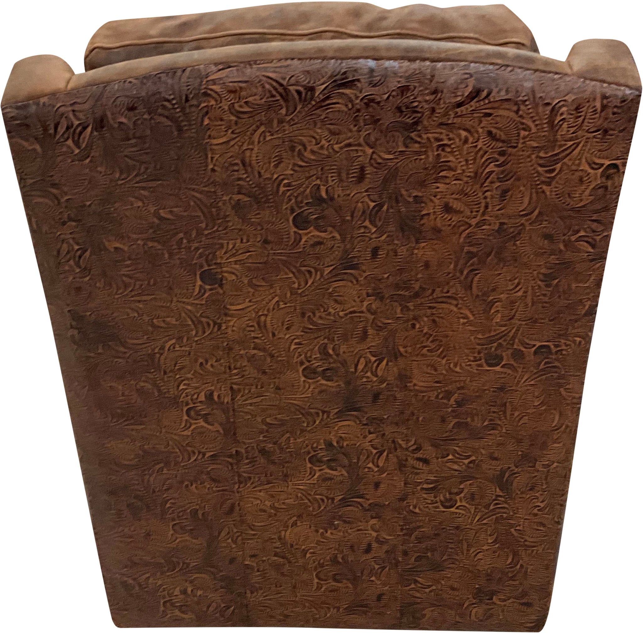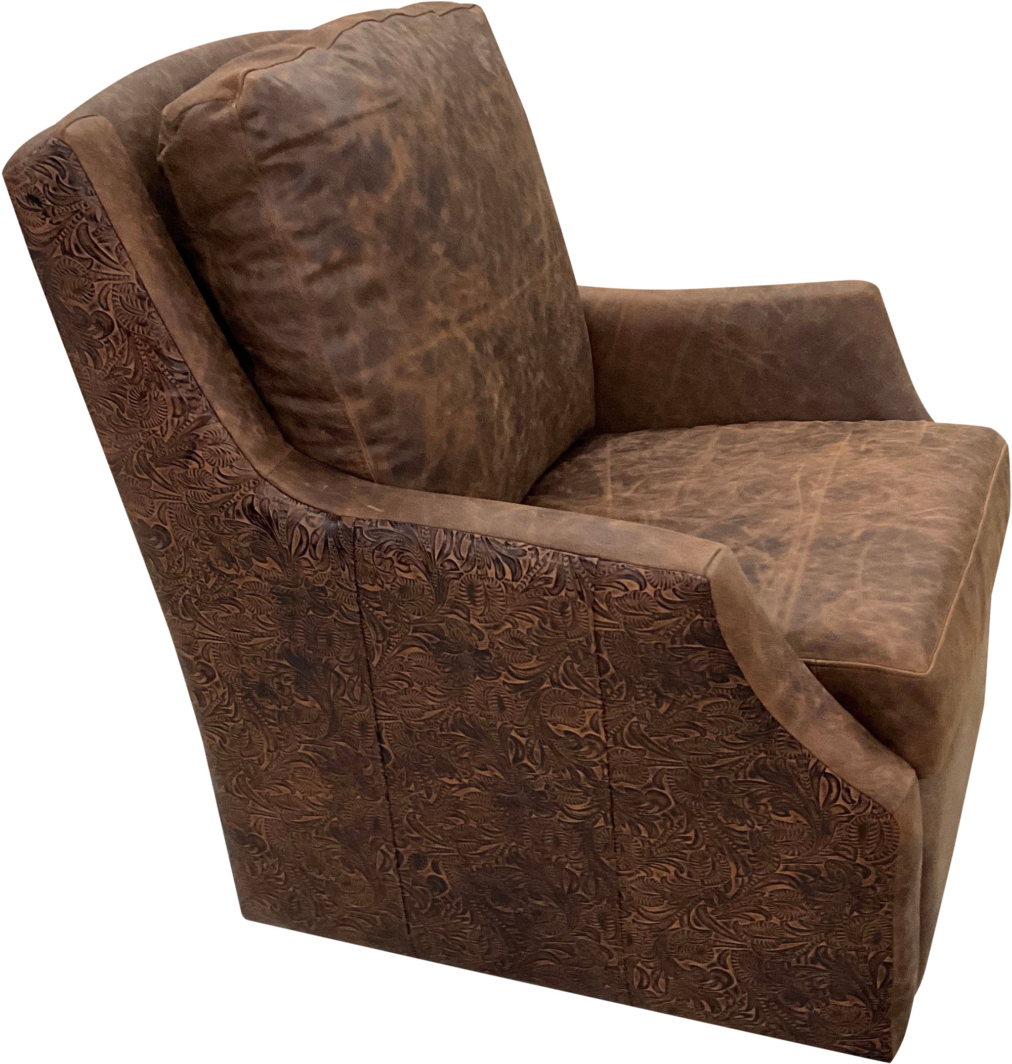 Great Blue Heron's Priest River Swivel Glider, elegantly upholstered in Cora Pecan and accented with Legends Moccasin embossed leather, boasts clean lines perfect for modern Western homes. Balancing aesthetics and relaxation, its semi-attached back cushion and plush seat ensure style doesn't come at the cost of comfort.